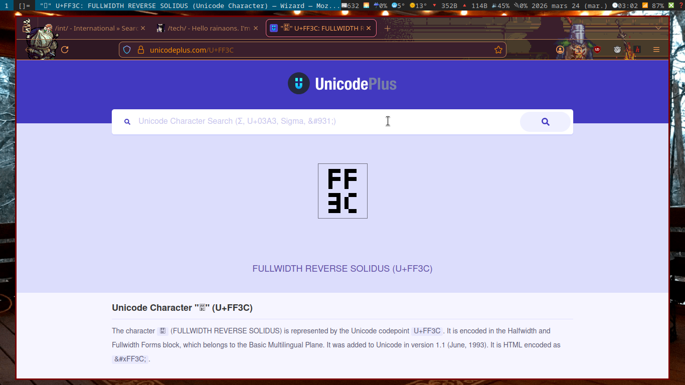 Does copying the ff03 character from your browser into the terminal or any other GUI software render it? (lowriter, xed, gedit)